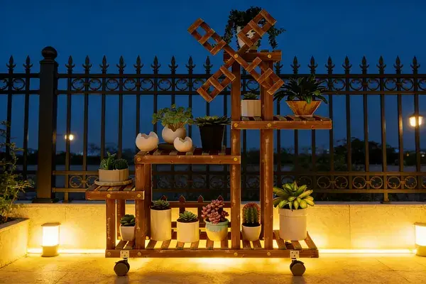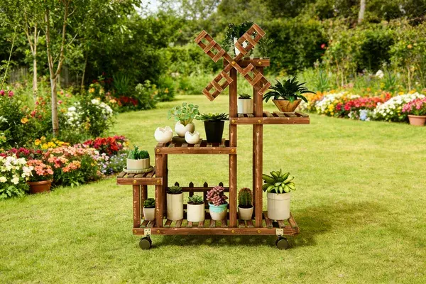 Windmill Design: Wooden lattice windmills turn gently with the breeze, casting dappled sunlight through their slats onto the ground—even the play of light and shadow becomes part of the romance (a “viral photo prop” among Western gardening influencers on Instagram). Multi-tiered Layout: From succulents at the base, ferns in the middle, to vines at the top, the staggered arrangement of over 10 planters instantly creates “layered aesthetics” in your small courtyard. Achieve magazine-worthy landscaping without hiring a gardener.